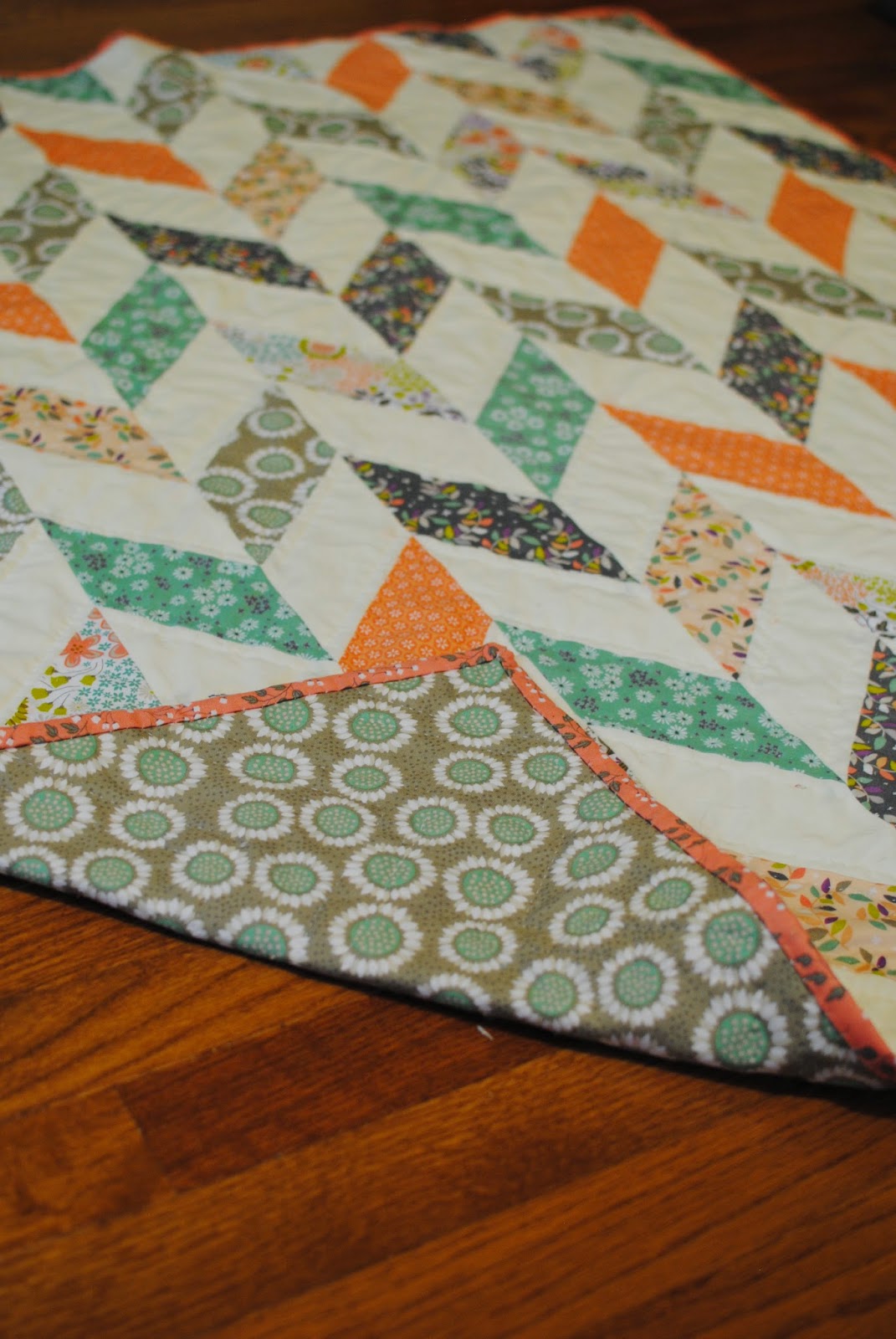One of my dearest friends brought an adorable baby girl into to the world earlier this year. Naturally, the baby was in need of a quilt from her "Aunt" Kelsie! My friend isn't a big fan of super baby-looking pink things, so I chose the more classic herringbone quilt pattern with different colors mixed in.